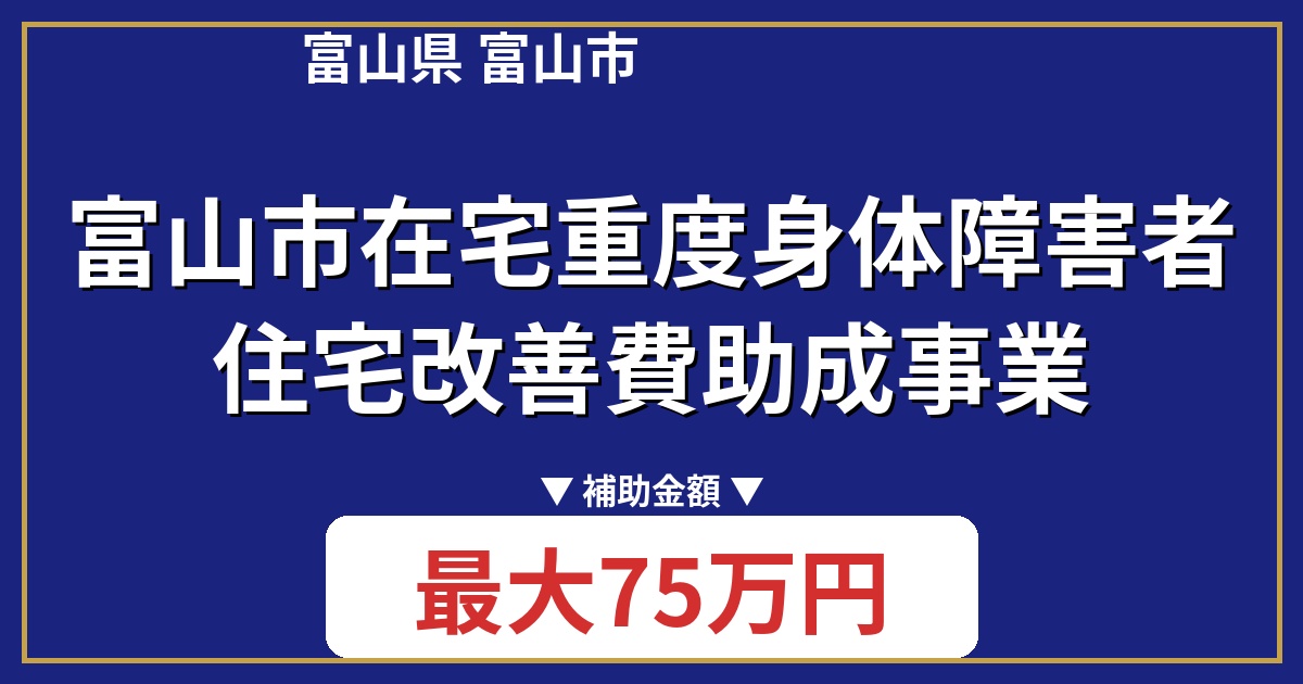 富山市在宅重度身体障害者住宅改善費助成事業は、市内に居住する在宅の重度身体障害者の方の住宅改修を支援する制度です。居室、浴室、便所、玄関などのバリアフリー化を目的とした改修工事費用の一部を補助します。所得税非課税世帯であることが条件となります。