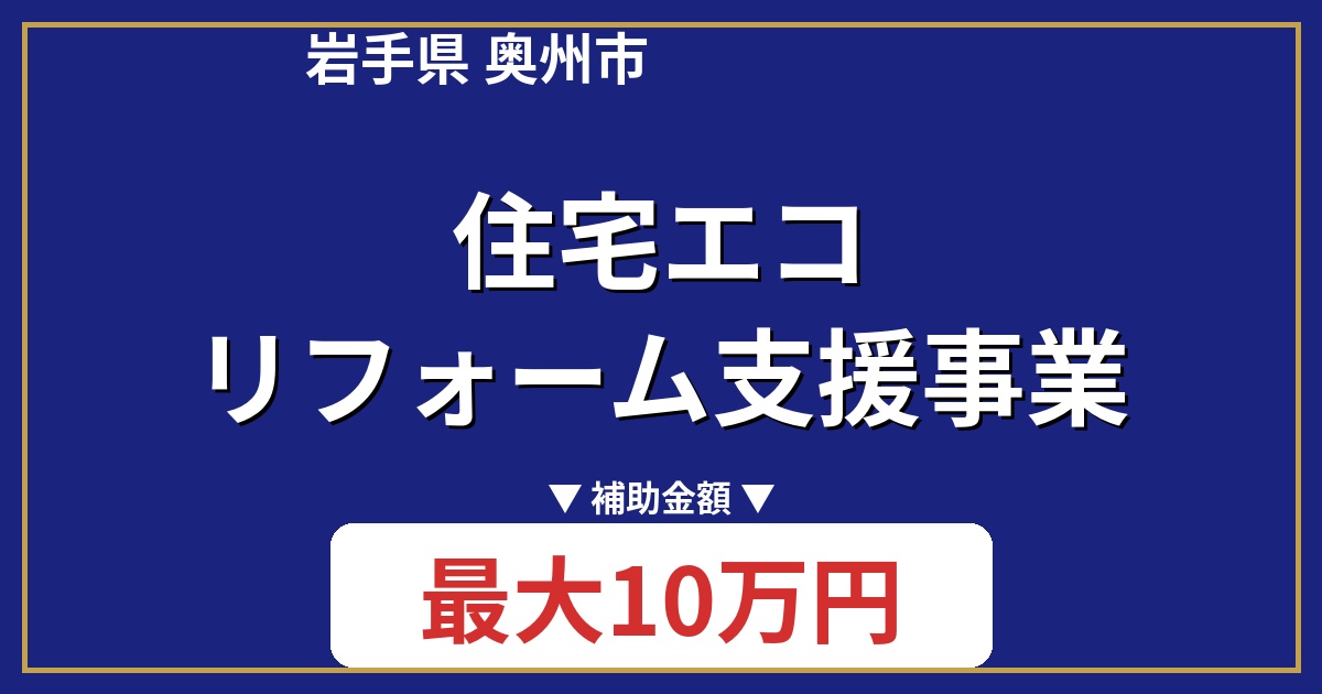 岩手県奥州市にお住まいの皆様へ。住宅エコリフォーム支援事業は、省エネリフォームを応援する制度です。断熱工事や省エネ設備の設置で、快適な住まいづくりをしませんか?奥州市が実施するこの補助金制度を活用して、住まいの価値を高めましょう。