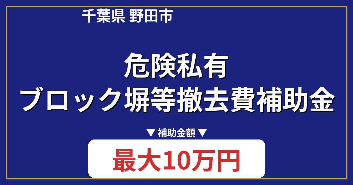 千葉県野田市では、地震時のブロック塀倒壊による事故を防ぐため、危険なブロック塀の撤去費用を補助する制度があります。この補助金は、道路に面したブロック塀の撤去費用を一部負担することで、安全な歩行空間の確保を目的としています。