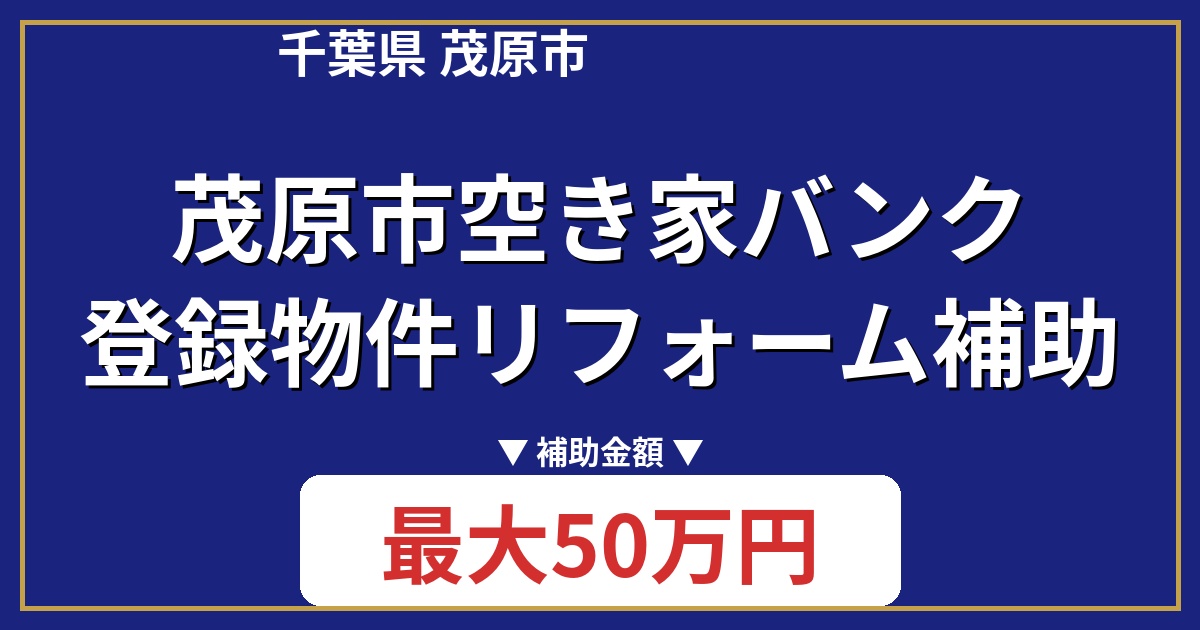茂原市空き家バンク登録物件リフォーム補助は、空き家バンクを通じて空き家を購入した方が行うリフォーム工事を対象とした補助金制度です。工事費用の2分の1が補助され、最大50万円まで受給可能です。茂原市の空き家対策と、移住・定住促進を目的としています。