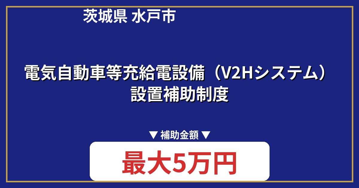 この制度は、V2Hシステム設置にかかる費用の一部を補助するものです。補助金は、設置費用の100%が補助され、上限額は5万円です。申請者は、事前に水戸市に申請し、交付決定を受ける必要があります。